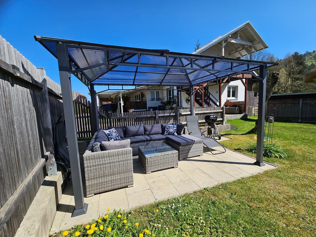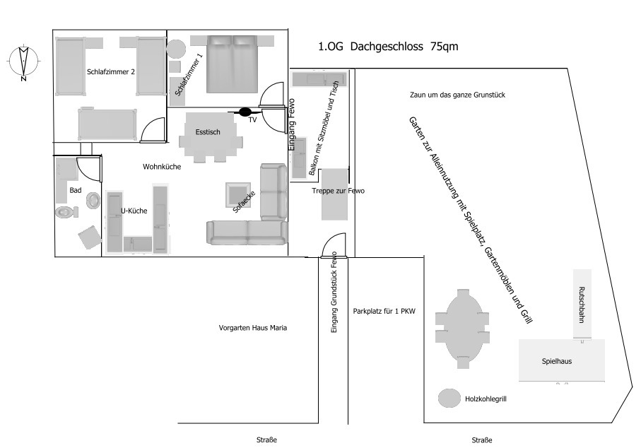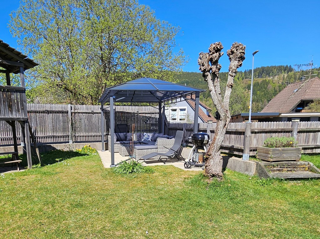 eigener Garten mit Grill, Gartenmöbeln und Spielhaus,