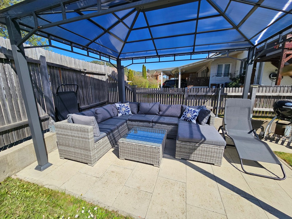 eigener Garten voll umzäunt mit Grill, Gartenmöbeln und Spielhaus,